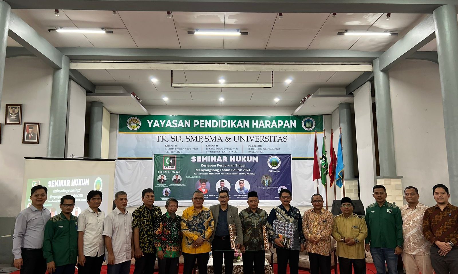 Fakultas Hukum Universitas Harapan Medan (UnHar) bekerja sama dengan Korps Alumni Himpunan Mahasiswa Islam (KAHMI) Medan menggelar seminar bertajuk “Menyongsong Tahun Politik 2024 Pasca Putusan Mahkamah Konstitusi Nomor 65/PUU-XXI/2023”. Acara yang berlangsung pada 12 September 2024 di Aula Utama UnHar ini menghadirkan sejumlah pakar hukum dan politik, termasuk akademisi, praktisi hukum, dan perwakilan dari KAHMI.